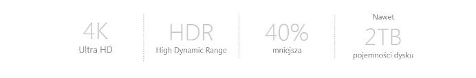 | 4K Ultra HD RozdziMEczość 4K Ultra HD czterokrotnie przewyższa standardowe HD, dzięki czemu obraz jest niezwykle wyraźny i realistyczny. Odtwarzaj treści w 4K w usługach Netflix i Amazon Instant Video i oglądaj filmy w jakości Ultra HD Blu-rayTM z niezwykłym poziomem realizmu dzięki technologii High Dynamic Range. |