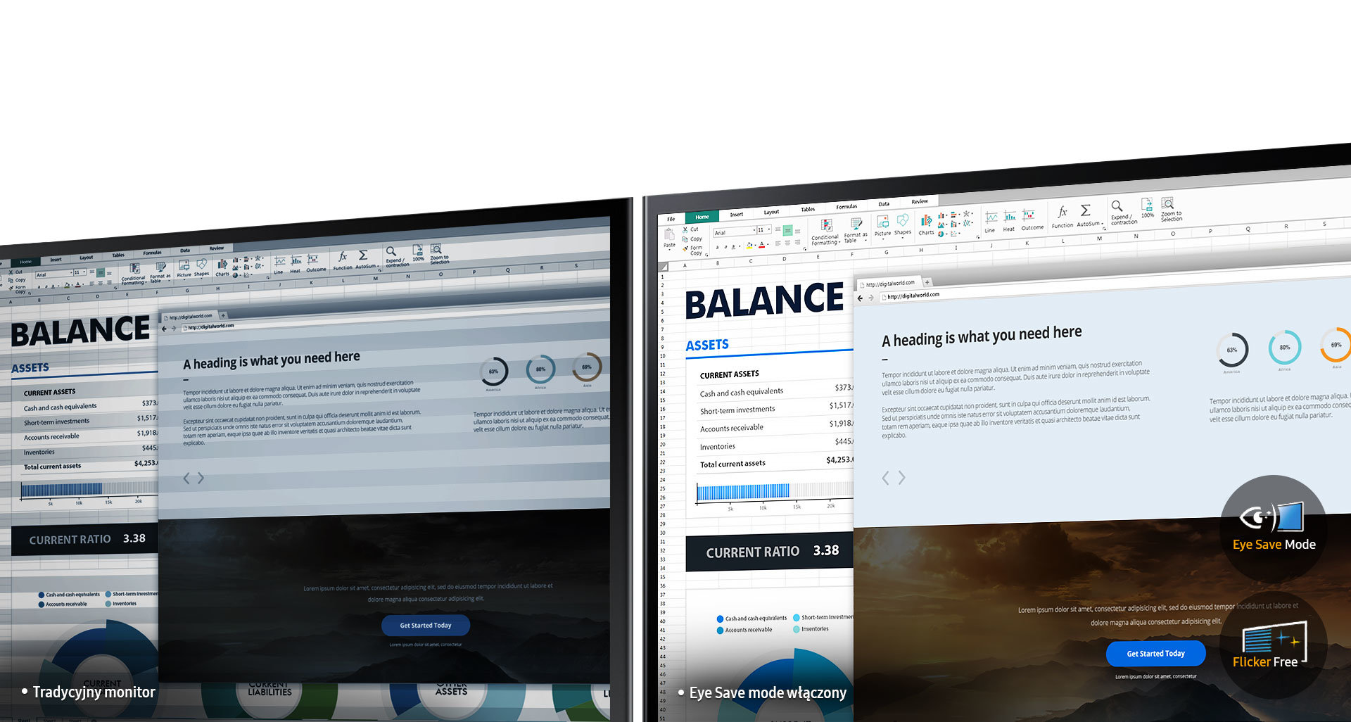 | Pozwól odpocząć oczom Od teraz praca i rozrywka staną się znacznie przyjemniejsze - nawet po wielu godzinach. Tryb Eye Saver redukuje emisję męczącego wzrok światła niebieskiego. Z kolei technologia Flikcer Free chroni Twoje oczy eliminując migotanie ekranu występujące w tradycyjnych monitorach. Zadbaj o swój komfort i zdrowy wzrok. |