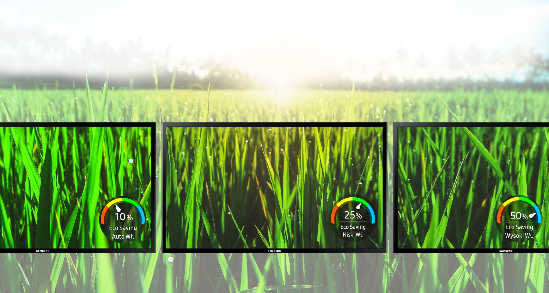 | Technologie pod znakiem Eco Automatycznie ustawiana jasność ekranu oszczędza energię, dostosowując ją w oparciu o czarne obszary wyświetlane na ekranie. Pozwala to zmniejszyć zużycie prądu o nawet 10%*. Poziom jasności możesz ustawić też samodzielnie - na 25%, 50% maksymalnego. |