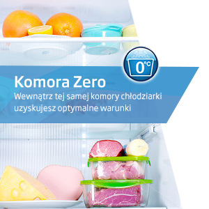 Komora zero To jedna lub dwie półki w części chłodzącej tuż nad szufladami na warzywa i owoce, do których nawiewane jest chłodzone powietrze w taki sposób, aby wewnątrz panowała temperatura ok 0˚C. Tutaj warto przechowywać produkty, które lubią niską temperaturę: świeże mięso, świeże ryby, nabiał czy wędliny. Dodatkowo zapewnia ona znacznie wyższy poziom wilgoci niż na innych półkach wewnątrz chłodziarki. Panują tam optymalne warunki do przechowywania np. surowego mięsa czy ryby. Korzyść: Wewnątrz tej samej komory chłodziarki uzyskujesz optymalną temperaturę i wilgotność idealną do przechowywania np. surowego mięsa czy ryby. Twoja ryba i mięso będą soczyste i długo świeże, a zapachy nie będą przedostawać się do innych części chłodziarki. |