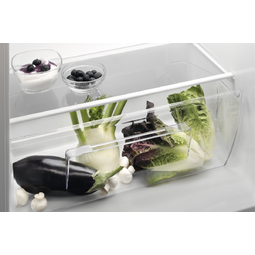 Szeroka szuflada dla zapewnienia większych możliwości przechowywania potraw Przechowywanie w lodówce większych produktów, np. selera może sprawiać pewne problemy. Dzięki powiększonej szufladzie, której szerokość odpowiada szerokości lodówki, przechowywanie większych artykułów spożywczych nie stanowi teraz kłopotu. |