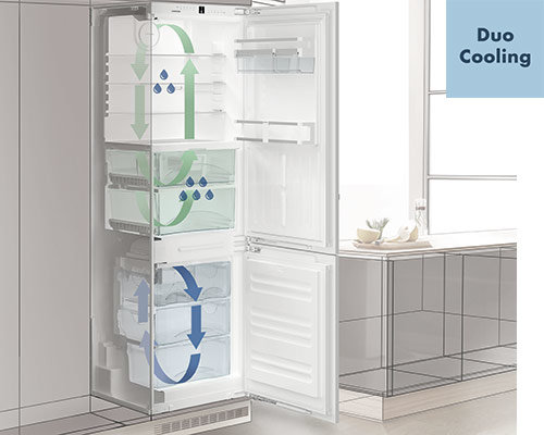 Dzięki dwóm oddzielnie regulowanym obiegom chłodniczym DuoCooling, temperaturę w chłodziarce i zamrażarce można ustawić całkowicie niezależnie od siebie. Pomiędzy obiema komorami nie dochodzi do wymiany powietrza, co zapobiega przenoszeniu się zapachów i wysychaniu produktów.