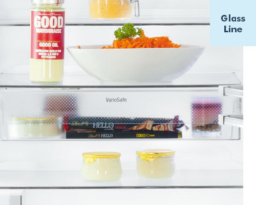 Stylowe wyposażenie GlassLine, to połączenie perfekcyjnego wykonania z atrakcyjnym designem. Eleganckie, szklane półki z hartowanego szkła są łatwe do mycia oraz posiadają wysoką wytrzymałość na obciążenia. Zarówno szklana dzielona półka, wsuwana jedna pod drugą, jak i pozostałe półki mogą zostać umieszczone na dowolnej wysokości wnętrza urządzenia.