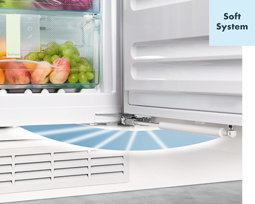 SoftSystem to innowacja zapewniająca jeszcze większą wygodę i bezpieczeństwo. Wbudowany w drzwiach urządzenia mechanizm tłumi ruch oraz pozwala na delikatne zamknięcie drzwi, nawet przy ich pełnym załadowaniu produktami. Drzwi zamykają się automatycznie od kąta otwarcia wynoszącego ok. 30°.