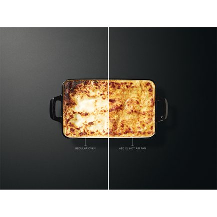 | ZAWSZE RÓWNOMIERNE EFEKTY PIECZENIA Nowy system pieczenia konwekcyjnego Hot Air zapewnia równomierny obieg gorącego powietrza w komorze piekarnika. Dzięki temu piekarnik nagrzewa się szybciej, a temperatura pieczenia może być zmniejszona nawet o 20%. |