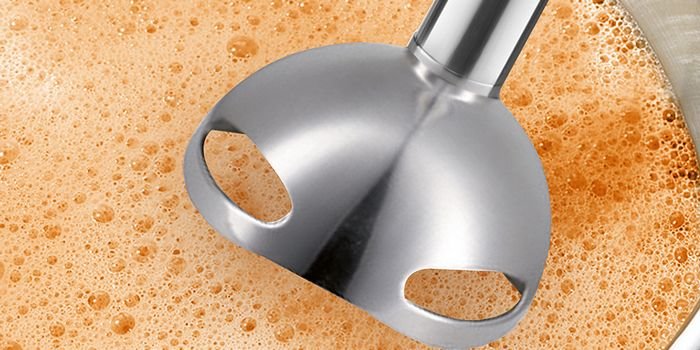 Przemyślana w każdym detalu, innowacyjna konstrukcja wewnętrznej części stopy końcowki sprawia, że przetwarzane produkty są idealnie zagarniane do wewnątrz i poddawane lepszemu i szybszemu rozdrabnianiu. Wyjątkowe tempo i sprawność miksowania jest zasługą imponujących właściwości tnących poczwórnego ostrza oraz doskonałego ukształtowania stopy, które zapobiega jej zasysaniu do dna naczynia.