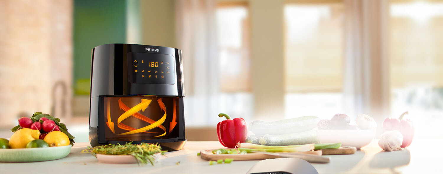 Wyjątkowa technologia Rapid Air zapewnia właściwy przepływ powietrza, a układ wnętrza urządzenia optymalnie rozprowadza ciepło, dbając o równomierne opiekanie potraw. Pyszne, chrupiące posiłki przygotujesz bez lub z niewielką ilością oleju2.