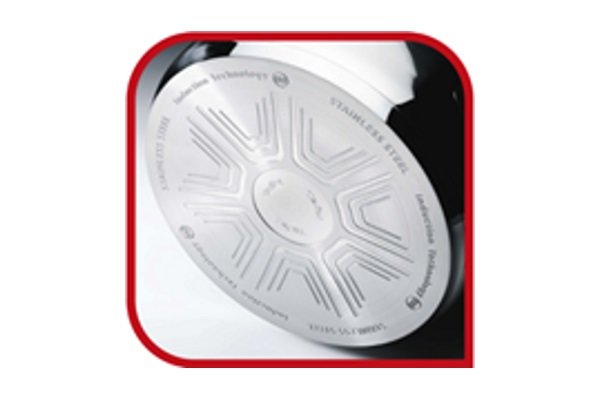 Wielowarstwowe dno indukcyjne, wytrzymałe i odporne na odkształcenia. Wbudowany w dno gruby dysk z aluminium, zapewnia idealną dystrybucję ciepła na całej powierzchni.