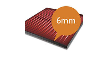 | Gruba płyta grilla jest zawsze gorąca — nawet podczas opiekania mrożonek Wyjątkowo gruba płyta opiekająca zachowuje więcej ciepła niż w przypadku zwykłego grilla i pozostaje gorąca nawet w przypadku opiekania mrożonek. Stała temperatura umożliwia szybsze i bardziej równomierne opiekanie jedzenia. Płyta opiekająca jest gorąca już podczas umieszczania produktów na grillu, co pozwala zachować ich smak i aromat. |