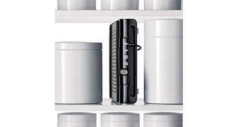 | Wygodne przechowywanie w pozycji pionowej Wygodne przechowywanie przewodu i tacki oraz urządzenia w pozycji pionowej. |