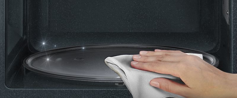 Tłuszcz i wysoka temperatura mogą odbarwić wnętrze kuchenki mikrofalowej. Powłoka z emalii ceramicznej temu przeciwdziała.