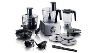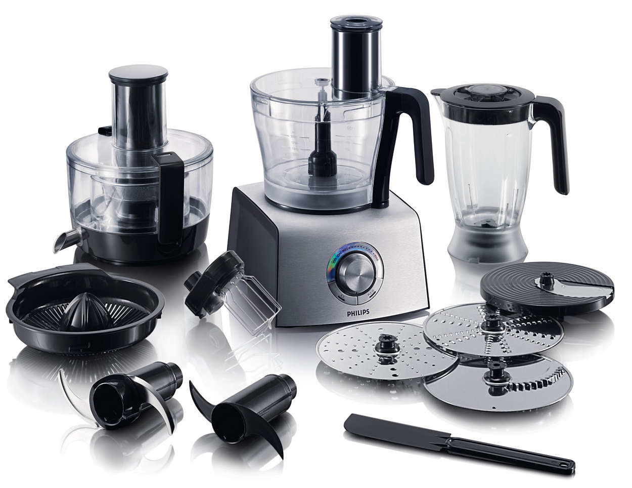 | 10 akcesoriów sprawia, że urządzenie posiada ponad 30 funkcji Ten robot kuchenny posiada końcówkę do mieszania i wyrabiania gęstego ciasta, którą można myć w zmywarce. Nóż ze stali szlachetnej pozwala na łatwe siekanie mięsa i warzyw. Dwie metalowe tarcze umożliwiają szatkowanie na drobno lub na średnią grubość oraz ucieranie produktów żywnościowych. Nietłukący się blender o pojemności 1,5 litra zapewnia dokładne miksowanie, kruszenie i mieszanie składników. Wyciskarka do cytrusów gwarantuje bezproblemowe wyciskanie owoców cytrusowych. Trzepaczka idealnie ubija składniki i miesza rzadkie ciasto. |