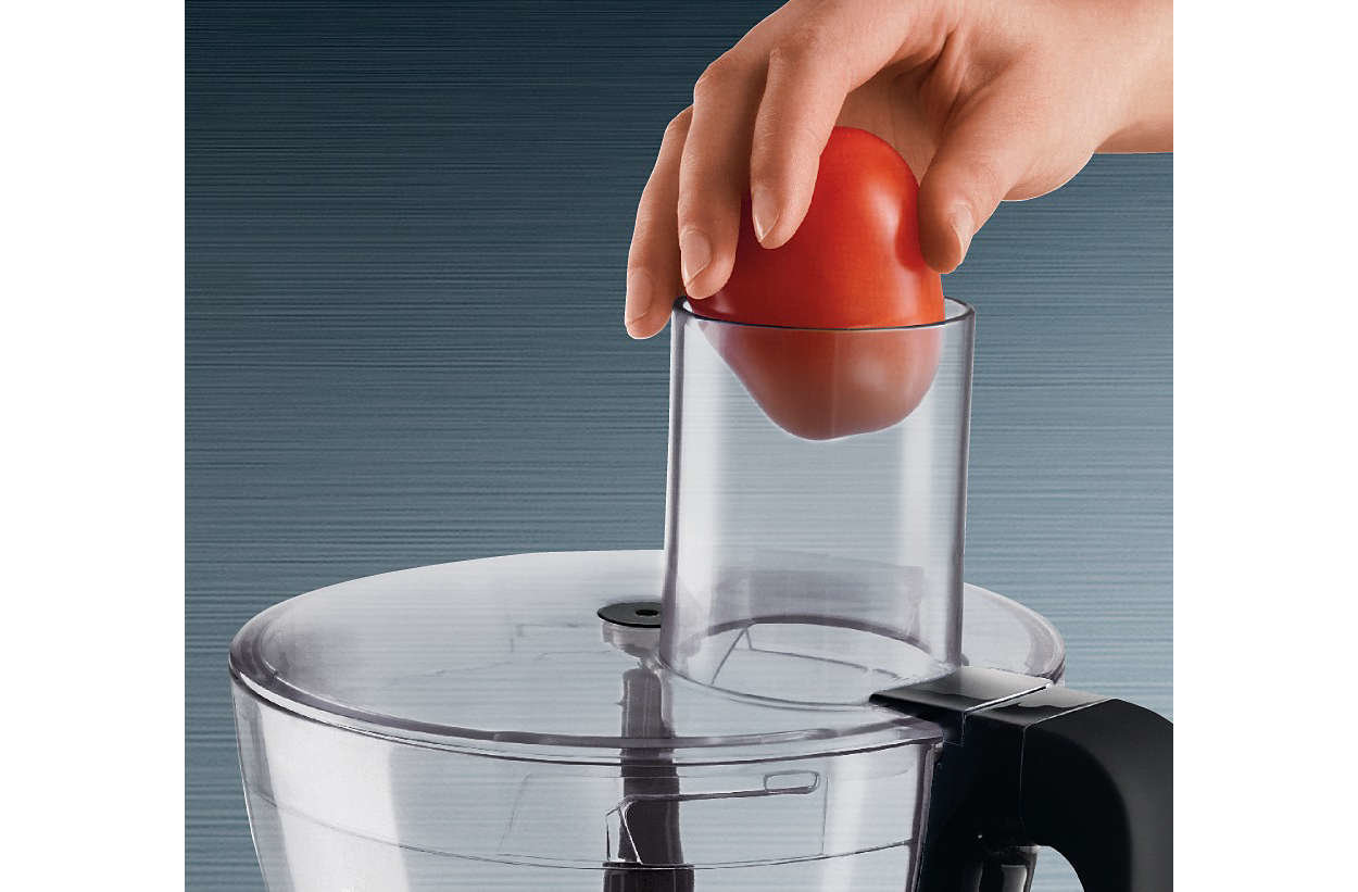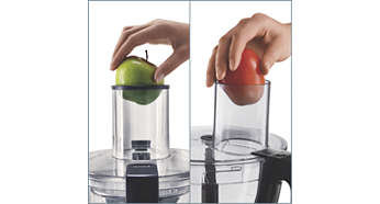 Duży otwór na produkty mieści całe owoce i warzywa Duży otwór na produkty mieści całe owoce i warzywa, więc nie trzeba ich uprzednio rozdrabniać. |