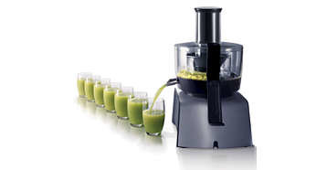 Wyciskanie szybsze nawet o 200% w porównaniu z innymi robotami z sokowirówką Ten robot kuchenny to pierwsze urządzenie z profesjonalnymi akcesoriami do wyciskania soku. Duży otwór na produkty i opatentowany, duży, metalowy filtr siatkowy zapewniają szybsze wyciskanie soku nawet o 200% w porównaniu z innymi robotami kuchennymi z sokowirówką. Ergonomiczna konstrukcja zapewnia szybkie czyszczenie i wygodne przechowywanie urządzenia. |