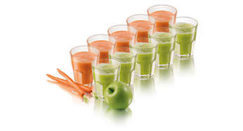 Do 2,5 litra soku za jednym razem Innowacyjny system wyciskania owoców z odwróconym sitkiem umożliwia wydobycie o 10% więcej soku*. W zależności od rodzaju wyciskanych owoców lub warzyw możliwe jest uzyskanie do 2,5 l soku w jednym przebiegu bez konieczności opróżniania pojemnika na miąższ. |