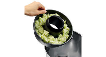 | Zebranie całego miąższu w jednym miejscu umożliwia jego łatwe usuwanie Cały miąższ zbiera się wyłącznie w miejscu, w którym powinien się znaleźć — w pojemniku na miąższ sokowirówki firmy Philips. Oznacza to, że nie trzeba już wydobywać miąższu z innych części, takich jak pokrywka. Zaokrąglona konstrukcja i gładkie powierzchnie bez żadnych zakamarków zapewniają łatwy dostęp do miąższu i łatwiejsze czyszczenie pojemnika. |