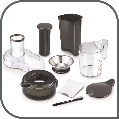 | Wyposażenie: | Filtr, Pojemnik na miąższ, Pojemnik na sok, Pokrywa, Popychacz, Szczotka do czyszczenia |