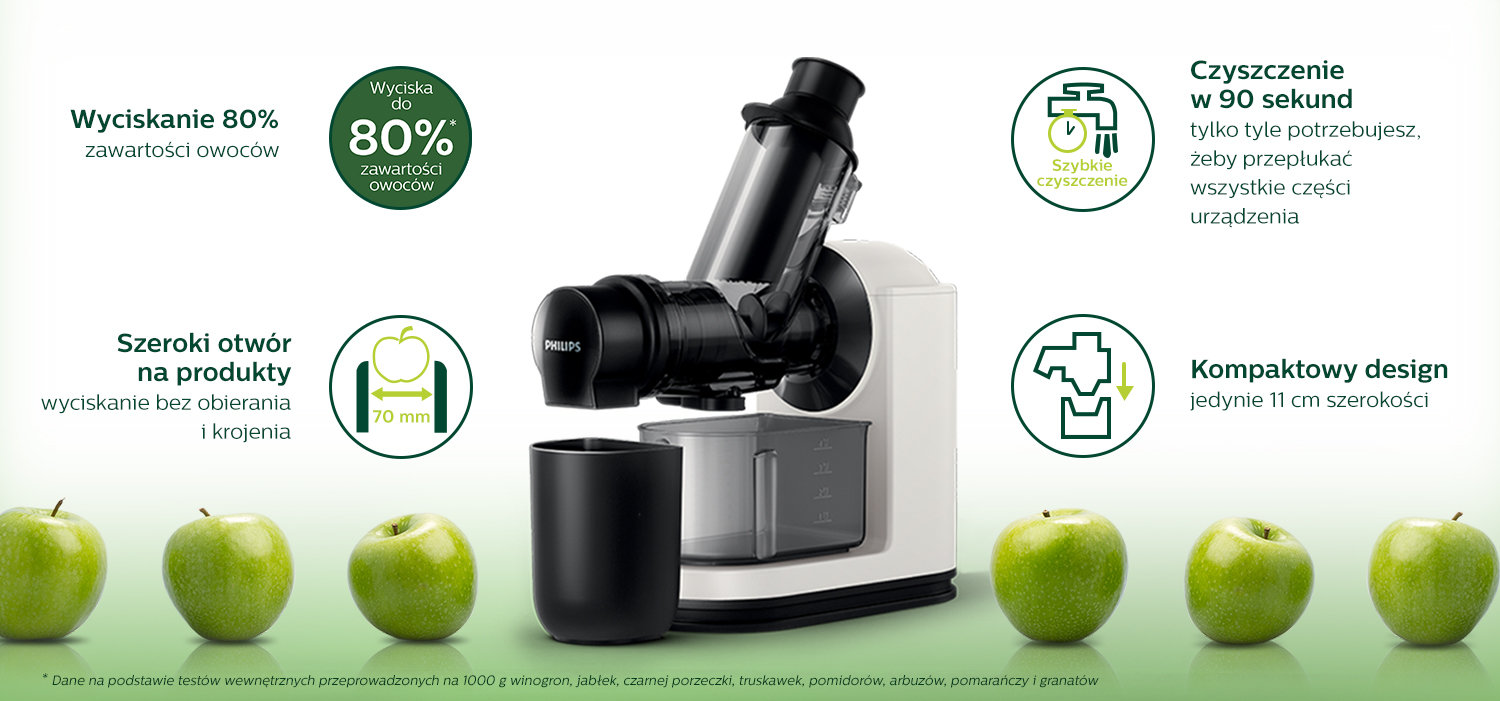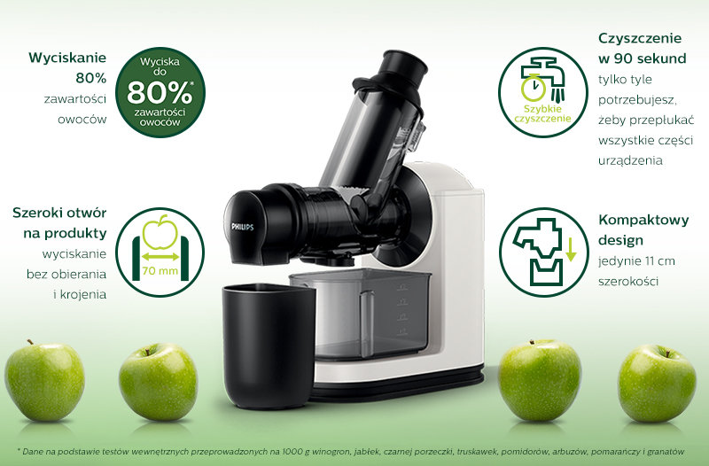 Wyciskarka wolnoobrotowa Philips poradzi sobie nie tylko z jabłkami, burakami czy marchewką, ale nawet z orzechami, warzywami liściastymi i z nasionami. Ogranicza Cię tylko wyobraźnia.