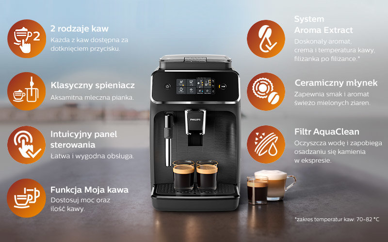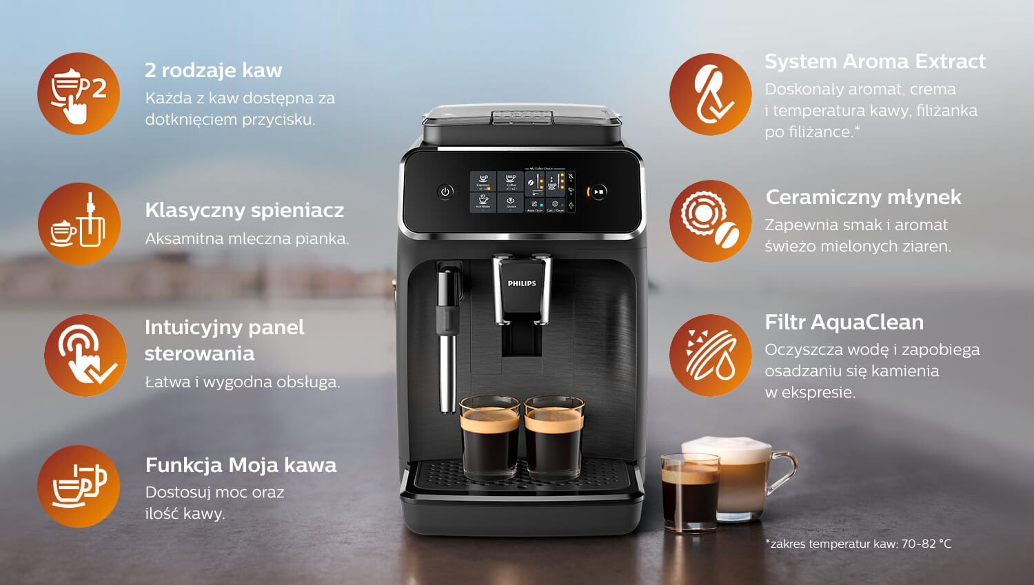Ekspres Philips 2200 posiada czytelny, dotykowy panel sterowania, który sprawia, że obsługa urządzenia jest wyjątkowo prosta. Wystarczy wybrać rodzaj kawy i dotknąć odpowiednią ikonkę, a aromatyczny napój zostanie błyskawicznie zaparzony!