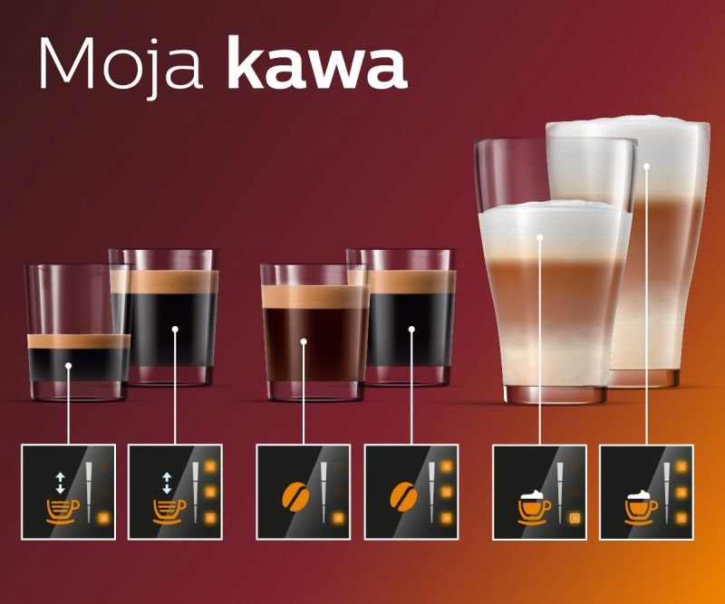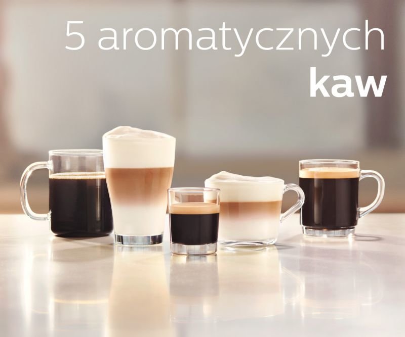 Twoja ulubiona kawa, już za dotknięciem przycisku! Wybierz jedną z 5 dostępnych kaw: klasyczną czarną, espresso, americano, cappuccino, latte macchiato, a ekspres Philips zaparzy ją dla Ciebie w mgnieniu oka. Delektuj się smakiem ulubionej kawy, kiedy tylko masz ochotę.