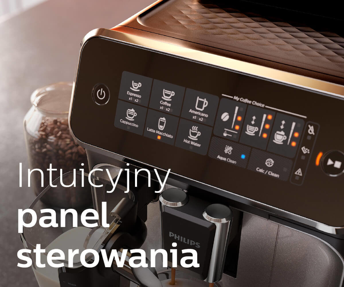 Ekspres Philips 3200 posiada czytelny, dotykowy panel sterowania, który sprawia, że obsługa urządzenia jest wyjątkowo prosta. Wystarczy wybrać rodzaj kawy i dotknąć odpowiednią ikonkę, a aromatyczny napój zostanie błyskawicznie zaparzony!
