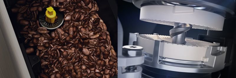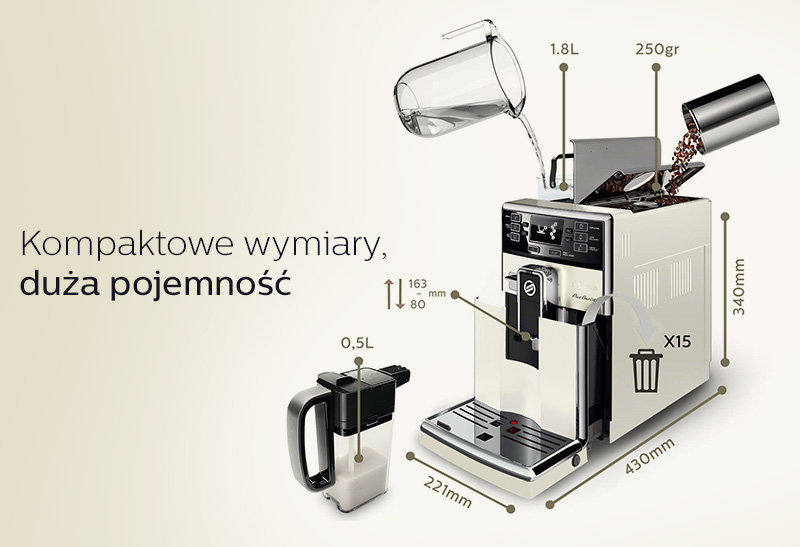 W kompaktowej obudowie zmieściliśmy pojemne pojemniki na ziarna, wodę i odpady. Przygotuj jeszcze więcej filiżanek kawy, rzadziej uzupełniając składniki.