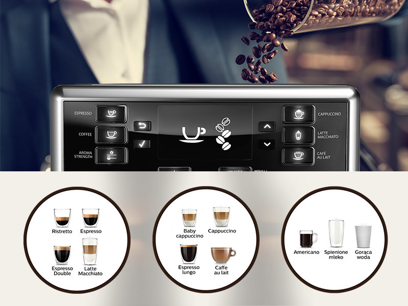 | Dostępne napoje: | Americano, Cafe au lait, Cappuccino, Espresso, Espresso Double, Gorąca woda, Kawa czarna, Latte Macchiato, Ristretto, Spienione mleko |