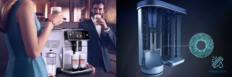 AquaClean to nasz opatentowany filtr do oczyszczania wody. Dzięki niemu kawa jest przygotowywana z krystalicznie czystej wody, co poprawia jej smak. Umożliwia usuwanie wapnia z wody, zanim wpłynie ona do ekspresu. Zapobiega to osadzaniu się kamienia. Przygotowujesz do 5 000* filiżanek perfekcyjnie zaparzonej kawy bez potrzeby odkamieniania ekspresu.