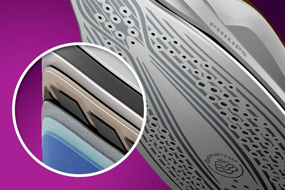 Technologia OptimalTEMP łączy działanie odpowiedniej temperatury i siły wyrzutu pary zapewniając bezpieczeństwo wszystkim prasowanym tkaninom. Nie ma potrzeby, aby odstawiać żelazko do bazy – bezpiecznie postawisz je bezpośrednio na desce nie martwiąc się o przypalenia.