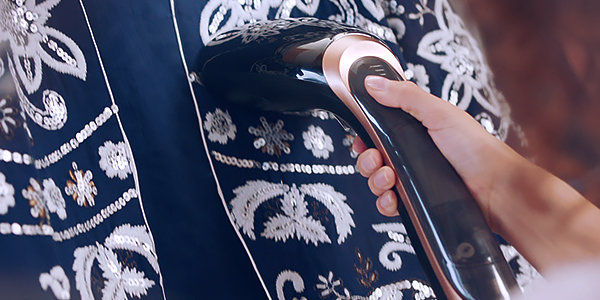 Pamiętaj, aby dotykać płytą parownicy bezpośrednio do tkaniny. Bez obaw, nie przypalisz ubrania! Dla uzyskania dobrych rezultatów drugą ręką delikatnie naciągaj materiał u dołu ubrania.