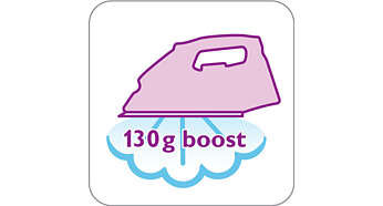 | Silne uderzenie pary (130 g) łatwo rozprasowuje najbardziej oporne zagniecenia Funkcji silnego uderzenia pary można używać do prasowania w pionie i usuwania uporczywych zagnieceń. |