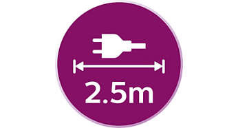 | Długi przewód (2,5 m) umożliwiający swobodne manewrowanie żelazkiem po desce do prasowania Długi przewód (2,5 m) zapewnia zasięg niezbędny podczas prasowania. Teraz możesz swobodnie manewrować żelazkiem po całej powierzchni deski do prasowania. |