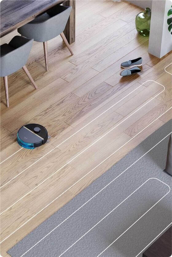 Dzięki systemowi nawigacji laserowej 360° (LiDAR), robot znajduje najlepszą drogę z pomieszczenia do pomieszczenia oraz między meblami. Dosięga każdego kąta i dojeżdża blisko ścian, aby żaden obszar nie został pominięty.