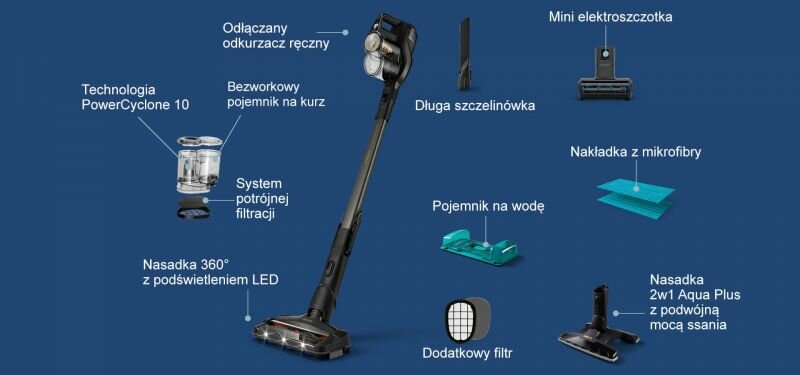 | Funkcje dodatkowe: | Funkcja Turbo, Mycie podłóg, Oświetlanie odkurzanego miejsca, Sygnalizacja zabrudzenia filtra, Technologia cyklonu... |