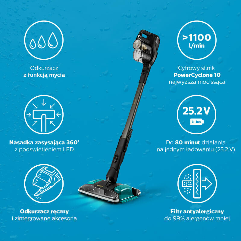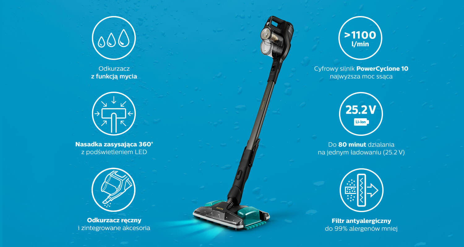*** Na podstawie badania online przeprowadzonego na grupie 108 użytkowników odkurzaczy bezprzewodowych Philips w Polsce, którzy nabyli w ciągu ostatnich 6 miesięcy swój pierwszy odkurzacz bezprzewodowy, Kantar Polska S.A., styczeń/luty 2021. **** Przy użyciu wody i detergentu.***** Na jednym ładowaniu w zależności od modelu, z nasadką mopującą.