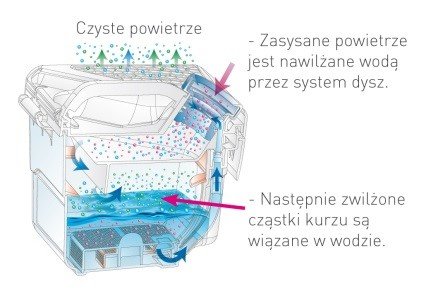 Wszelkie zassane zanieczyszczenia, brud, kurz, pyłki i alergeny oraz zapachy zostają zatrzymane w wodzie. Dzięki temu otrzymujemy doskonałą czystość w pomieszczeniu, bez zapachu kurzu w trakcie i po odkurzaniu. Dodatkową zaletą filtra Aqua+ jest to, że w trakcie odkurzania lekko nawilżamy powietrze w pomieszczeniu. Pozwala to uniknąć suchego, przegrzanego powietrza zaraz po odkurzaniu. Aby opróżnić pojemnik po odkurzaniu po prostu zanieczyszczenia wylewamy do kanalizacji - bez kontaktu z pyłem i kurzem.