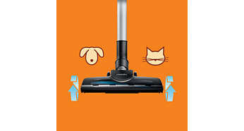 | Turboszczotka usuwa o 25% więcej włosów i kłaczków kurzu Turboszczotka głęboko czyści dywany oraz szybko usuwa z nich włosy i kłaczki kurzu. Obrotowa szczotka usuwa drobiny kurzu i włosy, dzięki czemu dywany są o 25% czystsze. Jest ona wyposażona w kółka, które zapobiegają powstaniu uszkodzeń w przypadku użycia jej na twardej podłodze. |