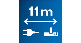 Zasięg 11 m umożliwia wygodne sprzątanie Zasięg 11 m umożliwia czyszczenie większych powierzchni bez konieczności przełączania wtyczki. |