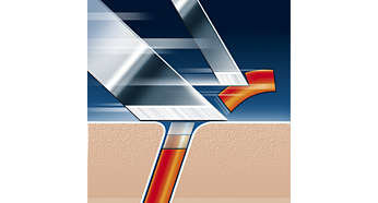 Technologia Super Lift & Cut z systemem podwójnych ostrzy System podwójnych ostrzy golarki firmy Philips: pierwsze ostrze unosi zarost, a drugie przycina go blisko skóry. |