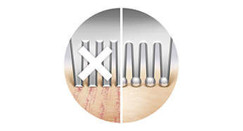 Trymer z perłowymi ząbkami oraz paski bezpieczeństwa zapobiegają skaleczeniom Trymer z zaokrąglonymi perłowymi ząbkami oraz paski bezpieczeństwa pod trymerem zapobiegają skaleczeniom, zapewniając komfort podczas golenia. |