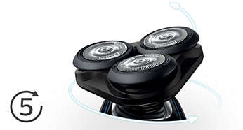 | Głowice poruszają się w 5 kierunkach, zapewniając szybkie i dokładne golenie 5-kierunkowe głowice o 5 niezależnych ruchach gwarantują bliski kontakt ze skórą w celu zapewnienia szybkiego i dokładnego golenia nawet na linii szyi i szczęki. |
