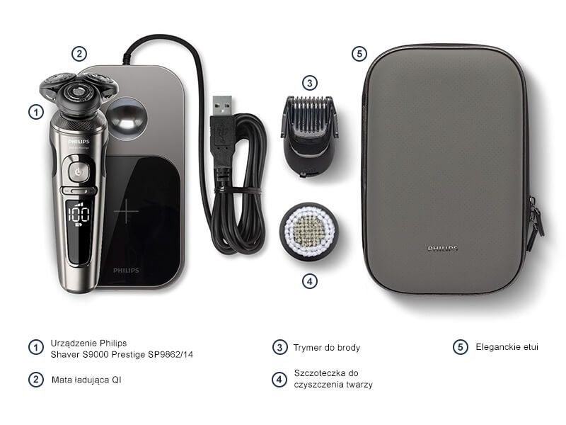 W komplecie znajduje się eleganckie etui, w którym przechowasz golarkę, ładowarkę oraz wszystkie akcesoria, każde w dedykowanym dla niego miejscu. Cały komplet świetnie sprawdzi się podczas biznesowych podróży i weekendowych wypadów.