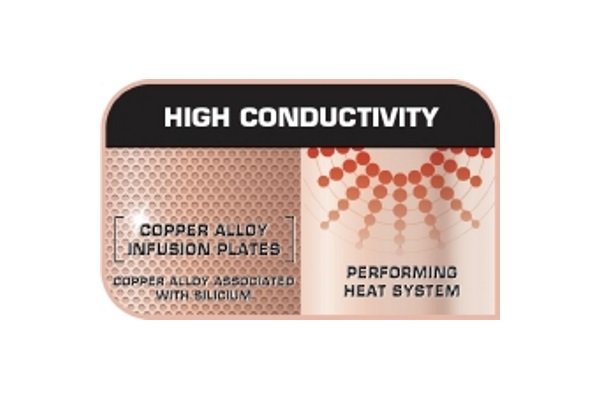 Perfekcyjne przenikanie ciepła Innowacyjna powłoka, będąca połączeniem miedzi i krzemu sprawia, że płytki idealnie rozprowadzają ciepło, prostując włosy i nie niszcząc ich struktury. |