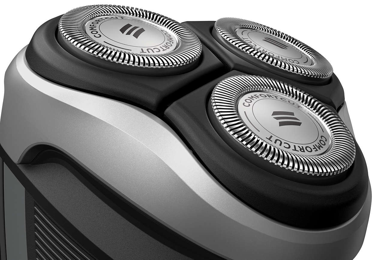 Zaokrąglone krawędzie płynnie przesuwają się po skórze, zapewniając bezpieczne golenie Skorzystaj z możliwości wygodnego golenia na sucho. Nasz system ostrzy ComfortCut z głowicami o okrągłym profilu został zaprojektowany z myślą o łatwym przesuwaniu się po skórze i jej ochronie przed zadraśnięciami i skaleczeniami. |