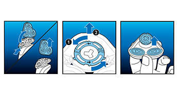 | Łatwa wymiana głowic 1. Otwórz golarkę, naciskając przycisk zwalniający; 2. Usuń pierścienie zabezpieczające, obracając je w lewo; 3. Wyjmij stare głowice golące i ostrożnie włóż głowice wymienne; sprawdź, czy głowice są dokładnie dopasowane; 4. Wymień pierścienie zabezpieczające i zamontuj je, obracając blokadę w prawo; 5. W przypadku prawidłowego zamknięcia głowica goląca zatrzaśnie się we właściwej pozycji (usłyszysz „kliknięcie”). |