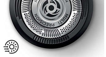 Ostrza unoszą, a następnie ścinają długie i krótkie włosy, zapewniając szybkie golenie Ciesz się szybkim i dokładnym goleniem. Ostrza MultiPrecision unoszą i przycinają włosy na linii skóry — wystarczy kilka pociągnięć. |