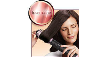 Dzięki ceramicznej powłoce turmalinowej włosy są bardziej lśniące Zastosowana w suszarko-lokówce wyjątkowa ceramiczna powłoka turmalinowa chroni i odświeża włosy podczas stylizacji. Ta specjalna powłoka skutecznie i równomiernie rozprowadza ciepło, dodając blasku fryzurze w czasie jej układania. |