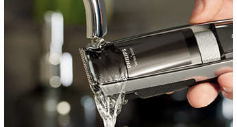 | 100-procentowa wodoodporność gwarantuje łatwe i dokładne czyszczenie Aby dokładnie wyczyścić trymer, wystarczy opłukać go pod bieżącą wodą, ponieważ jest całkowicie wodoodporny. |