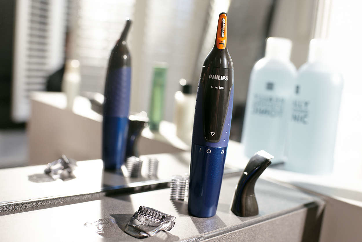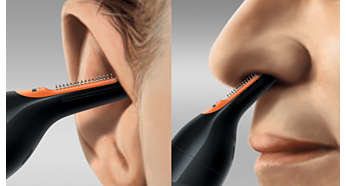 | Łatwe wychwytywanie włosów w uszach i w nosie Trymer do nosa firmy Philips ma idealny kształt ułatwiający wychwytywanie włosów w uszach i w nosie oraz przycinanie brwi. Przy użyciu trymera do nosa firmy Philips w całości pozbędziesz się niechcianego owłosienia. |