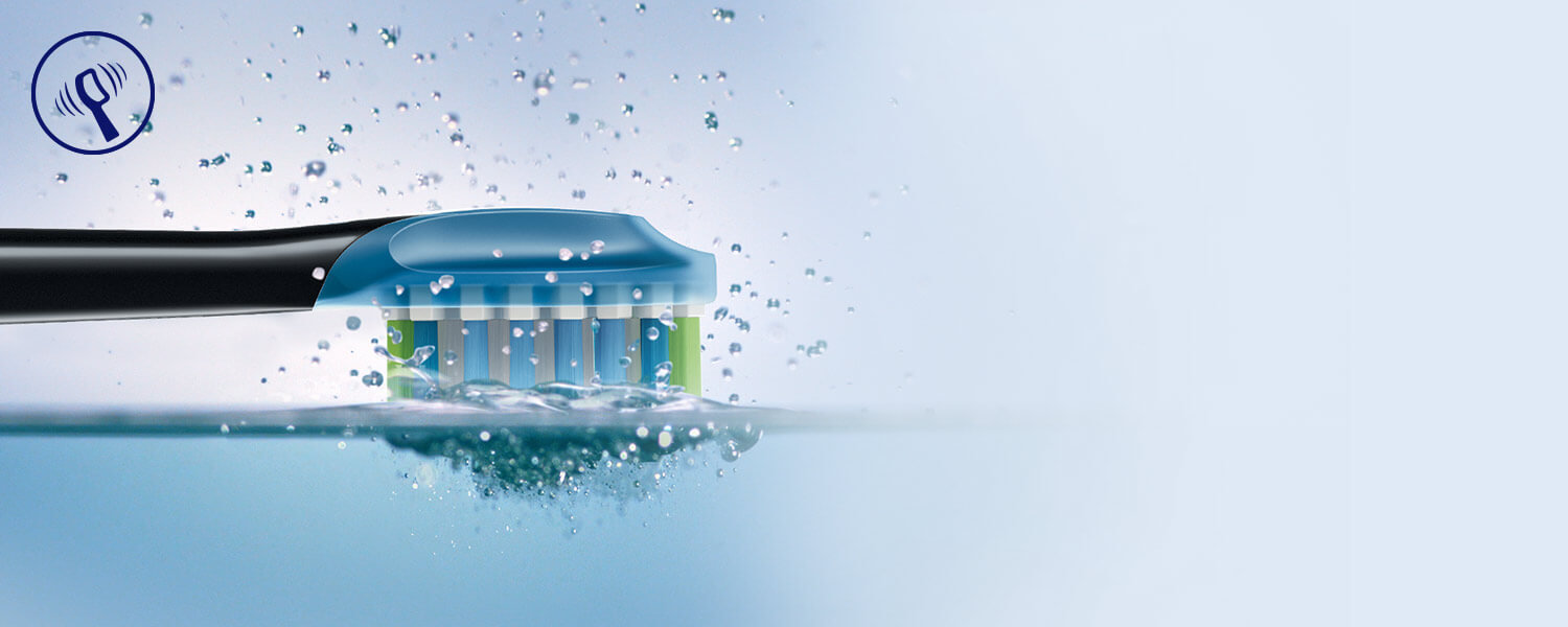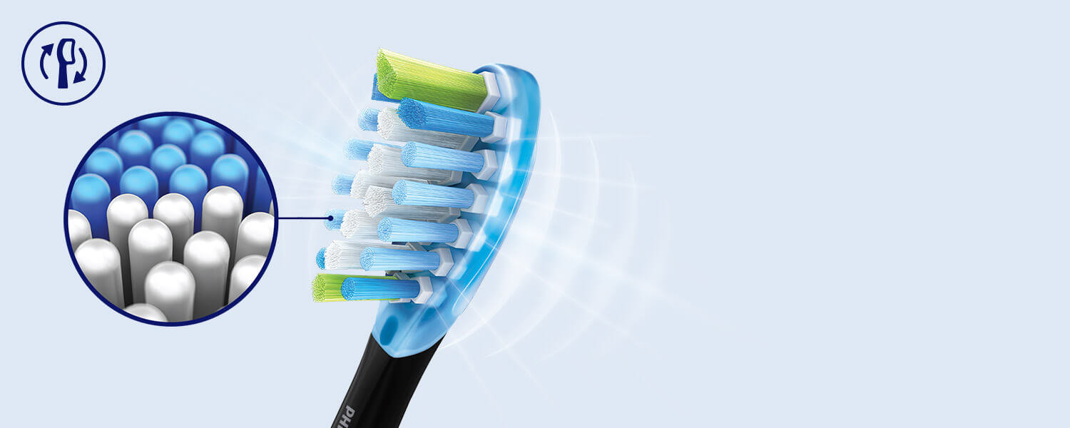 Aż 62 tys. ruchów na minutę nadaje dużą prędkość mieszaninie płynu (pasty i śliny) wytwarzając mikrobąbelki, a następnie szeroki zakres ruchu włosia oryginalnych końcówek Philips Sonicare wtłacza je głęboko w przestrzenie międzyzębowe zapewniając doskonałe czyszczenie.